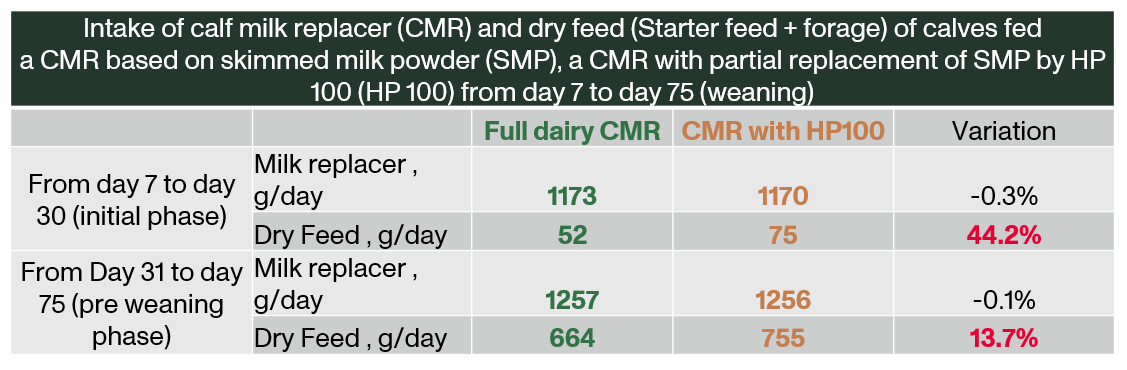 Heifers fed with CMR containing 12% of HP 100 replacing 22% of the initial 50% SMP formulation demonstrated a higher appetite to dry feed from the beginning to the end of the trial. This additional dry intake is a powerful lever for successful weaning. Moreover, it comes with a substantial cost advantage: depending on market trends, dairy proteins can be four to six times more expensive than processed plant-based alternatives.